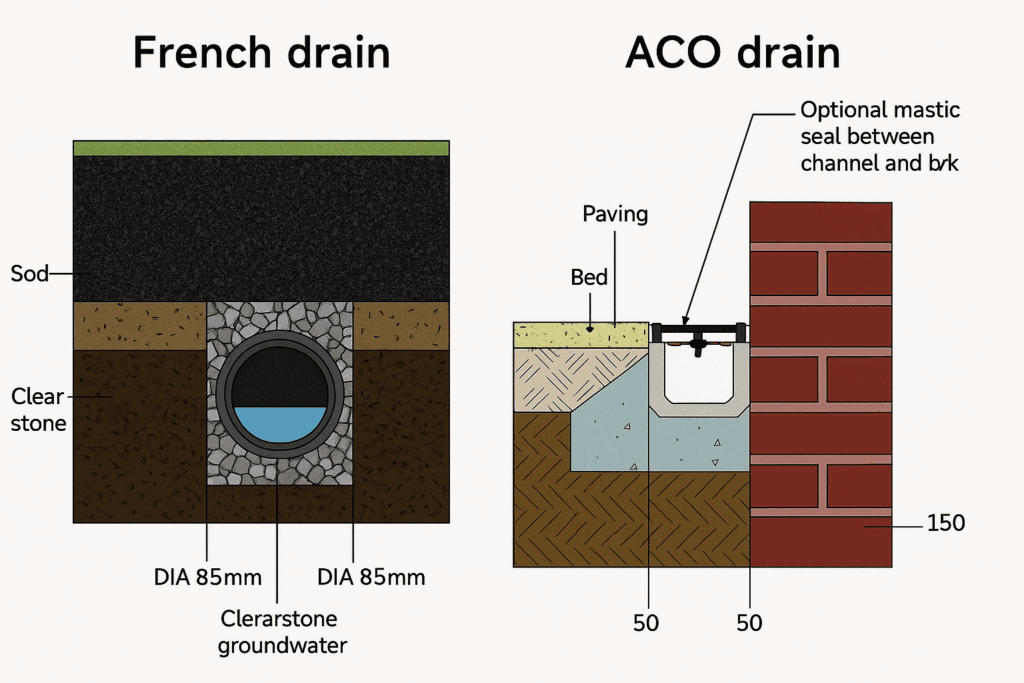 - ACO / linear channel drains collect surface water at finished level (door thresholds, patios, driveways).