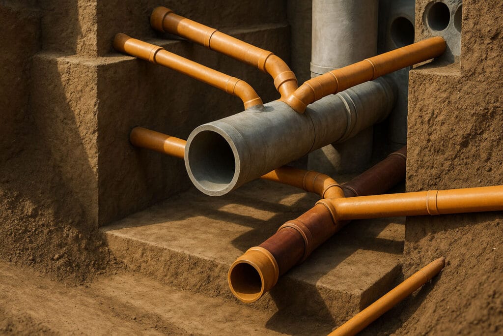 Seat bases on 100 mm blinding; stack rings/plastic chambers plumb and watertight; waterproof internal/external walls where specified; form benching after successful tests. - Pipe laying (upgrade)